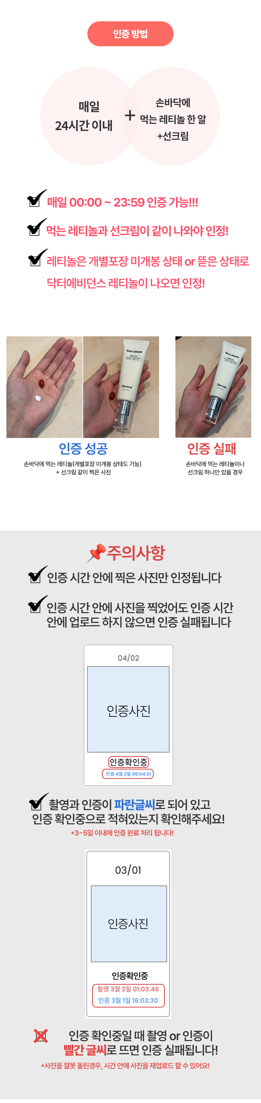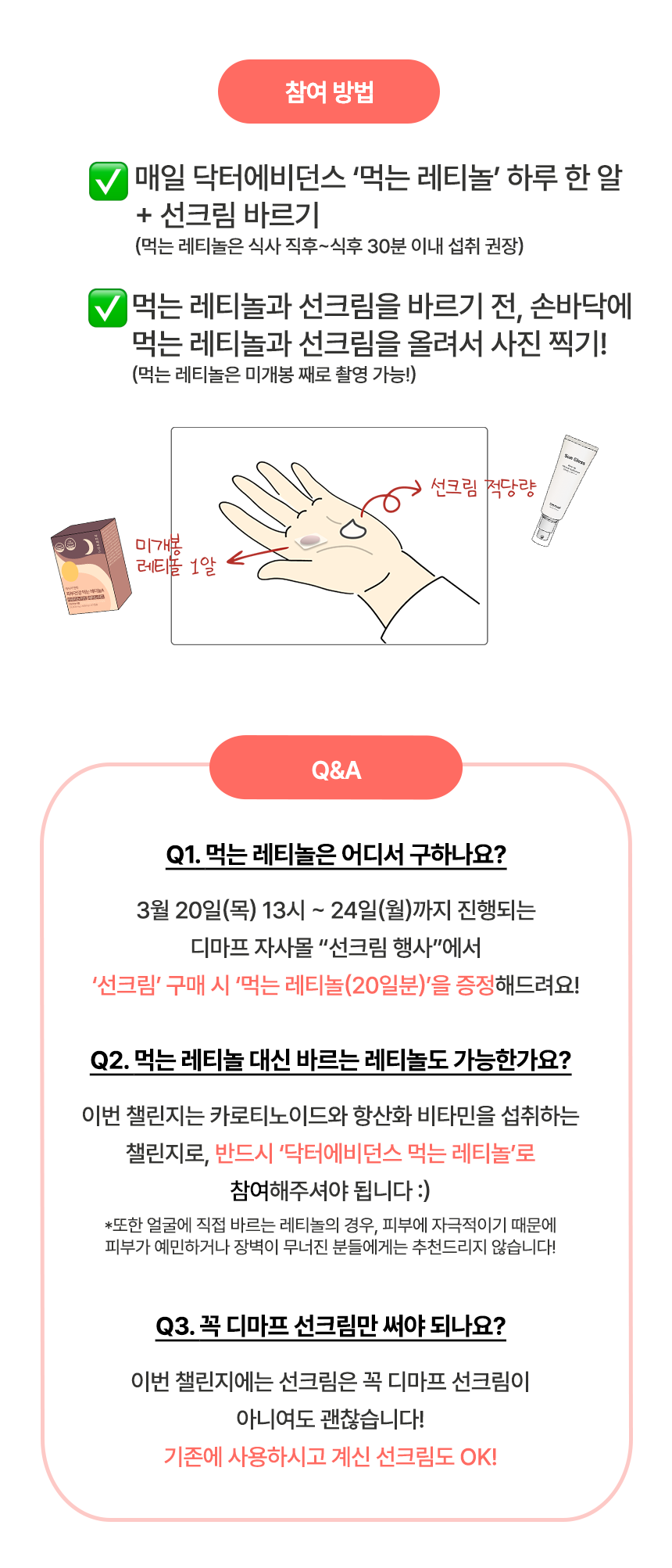 인증방법손바닥에 먹는 레티놀(미개봉도 가능) + 선크림 사진찍기
